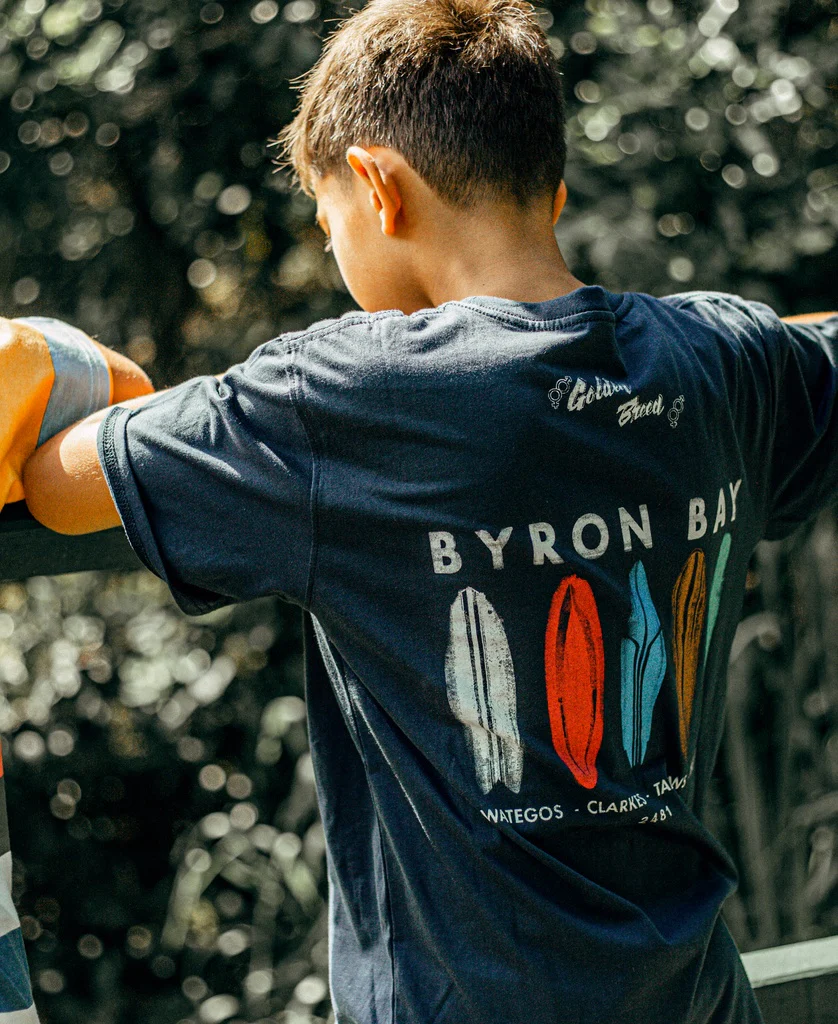 Our best selling Surf Town tee, the Boards Tee now available in Children's Sizes.. Available for Noosa, Byron Bay and Flinders, (colours may vary). A classic fit tee with unique surf town location and board design on back.