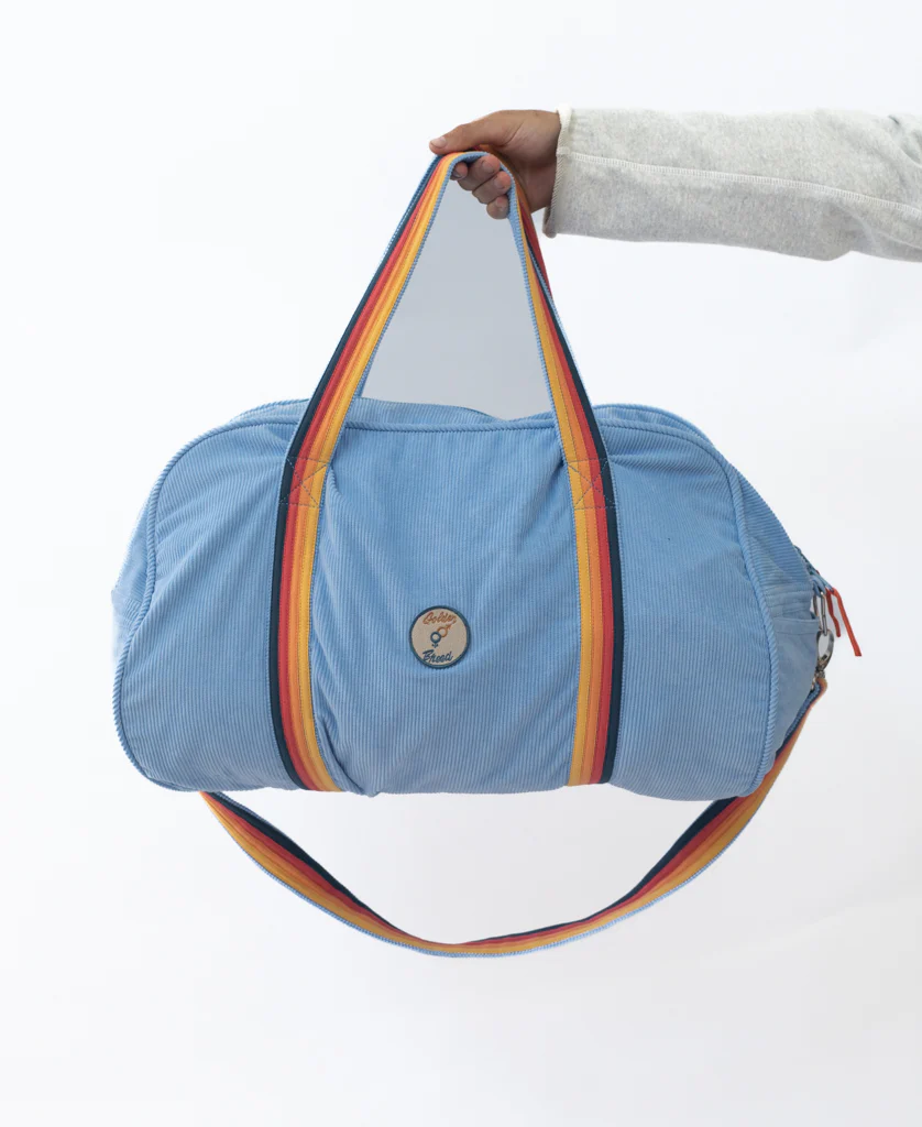 Golden Breeds New Long Island Stripe Cord Roll Bag is here to stay! The handmade weekend getaway bag. Features the applique coloured stripes of Golden Breed and oozes cali cool.